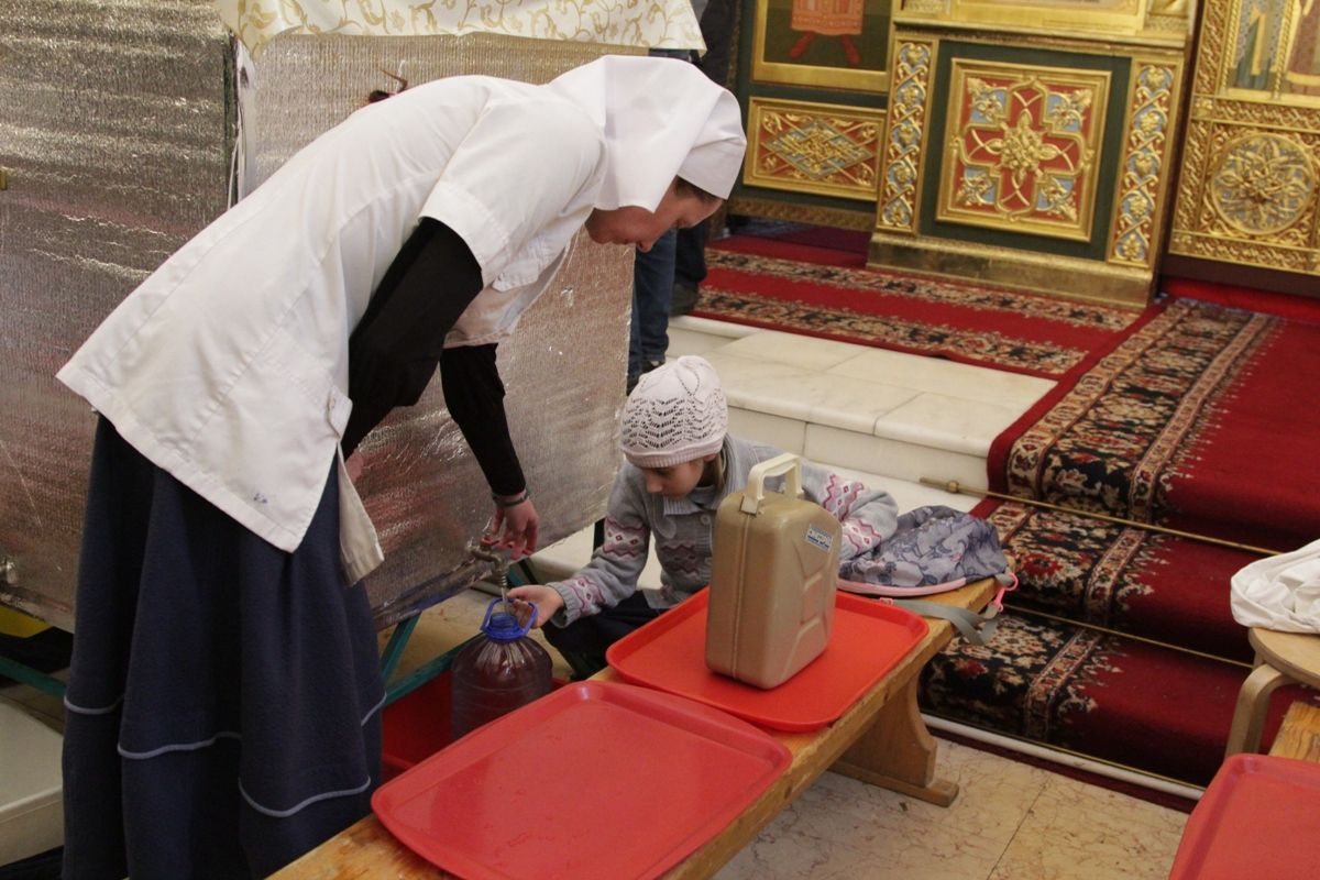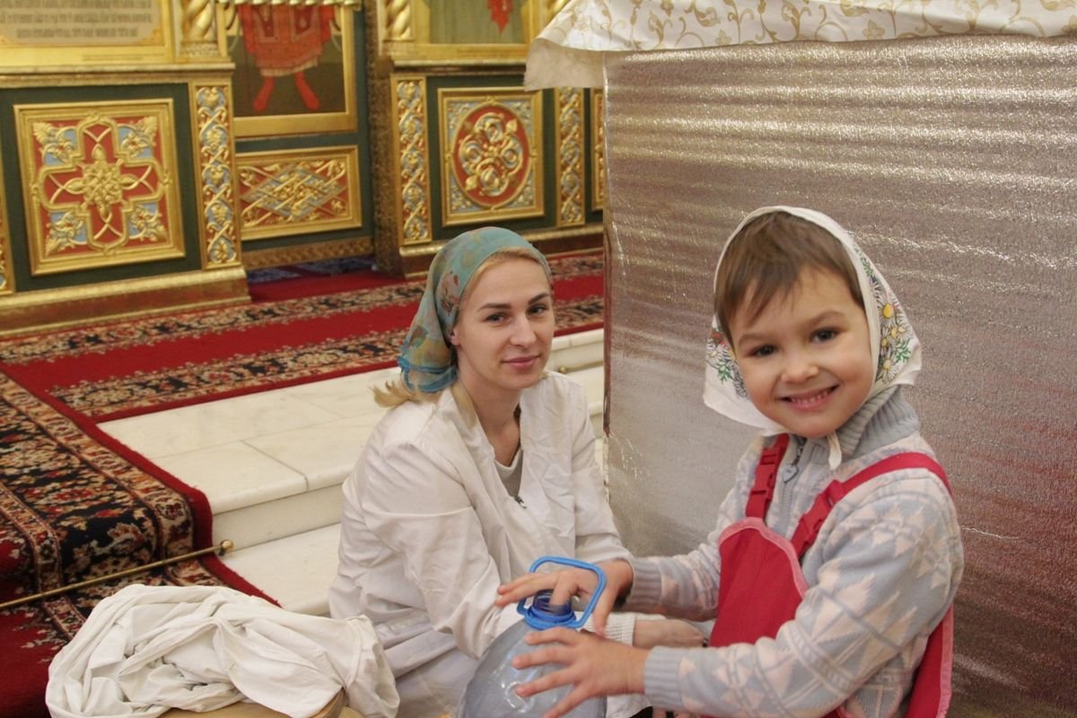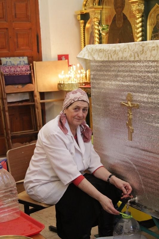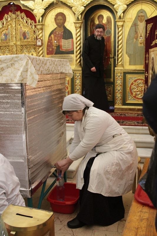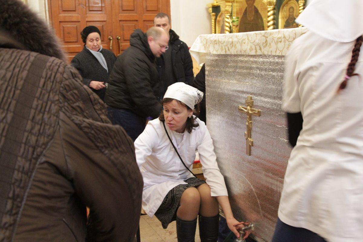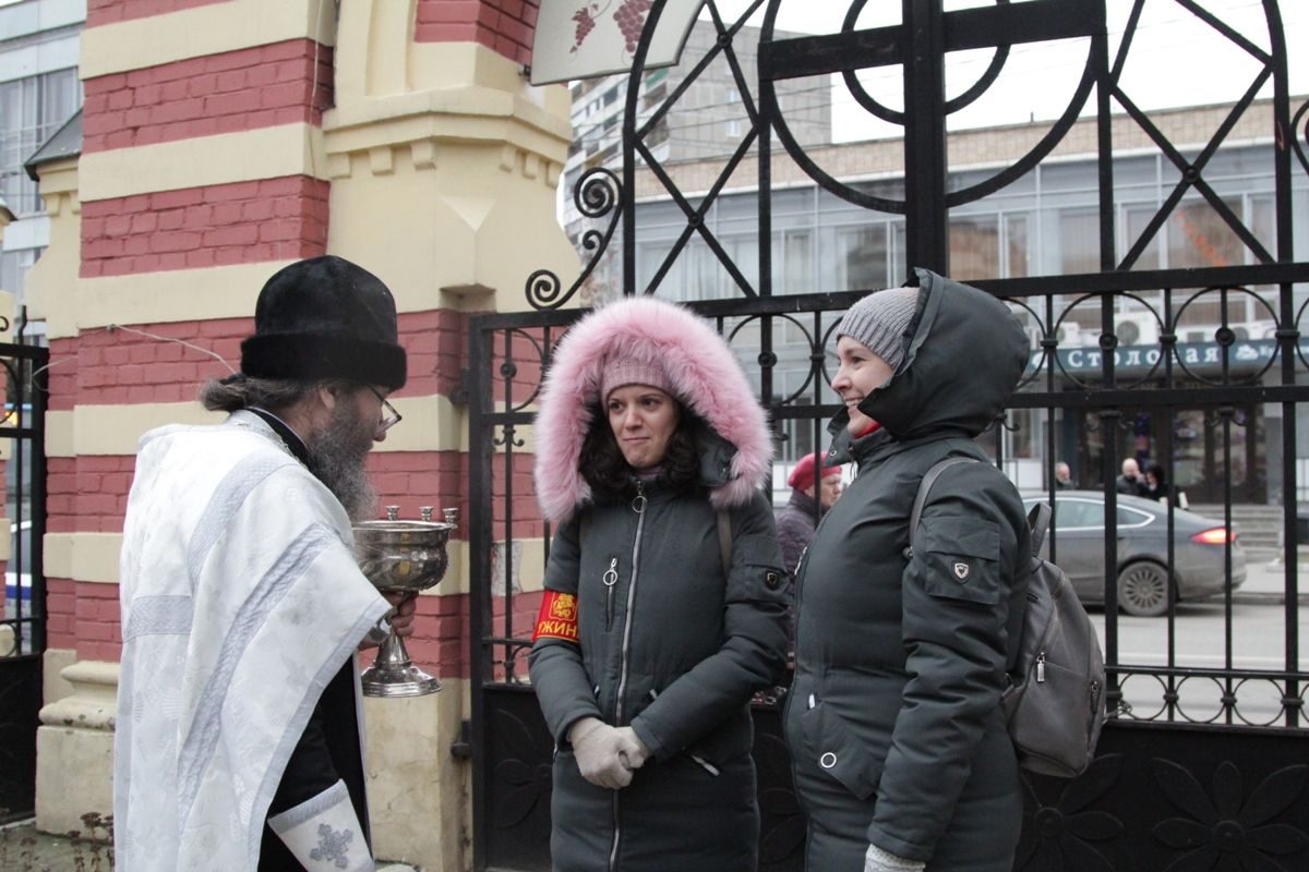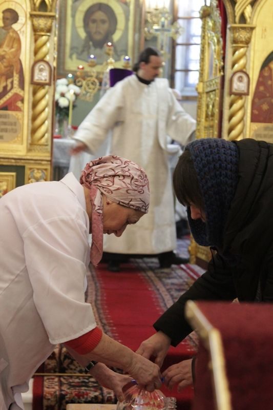 В раздаче святой Крещенской воды верующим участвовали сотрудники храма, сестры милосердия, ученики воскресной школы и волонтеры под руководством социального работника храма Николая Владимировича Ерошенко. Всем помощникам было предоставлено горячее питание — обед в трапезной храма.