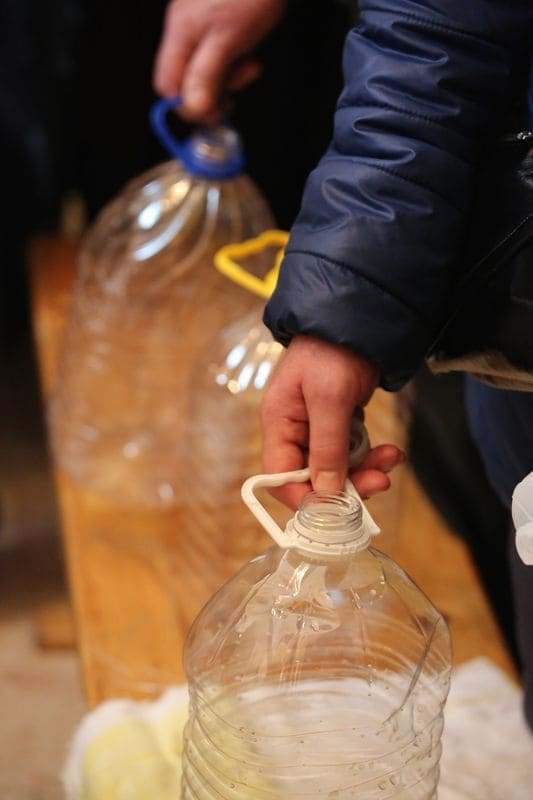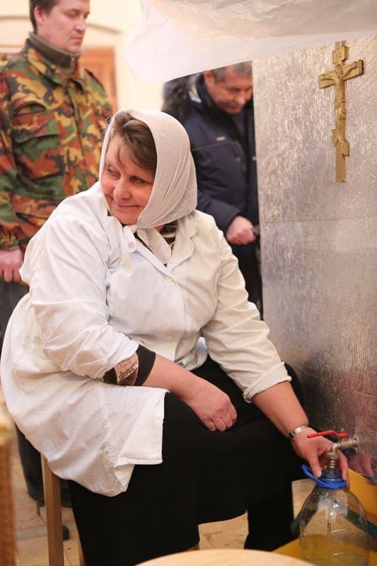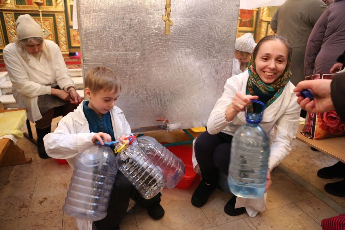 После великого освящения силами сотрудников и волонтеров началась раздача святой Крещенской воды верующим.