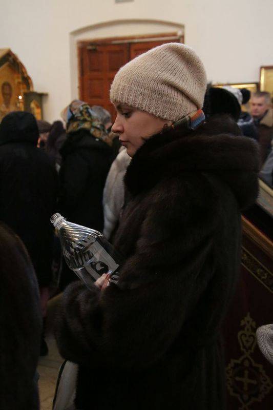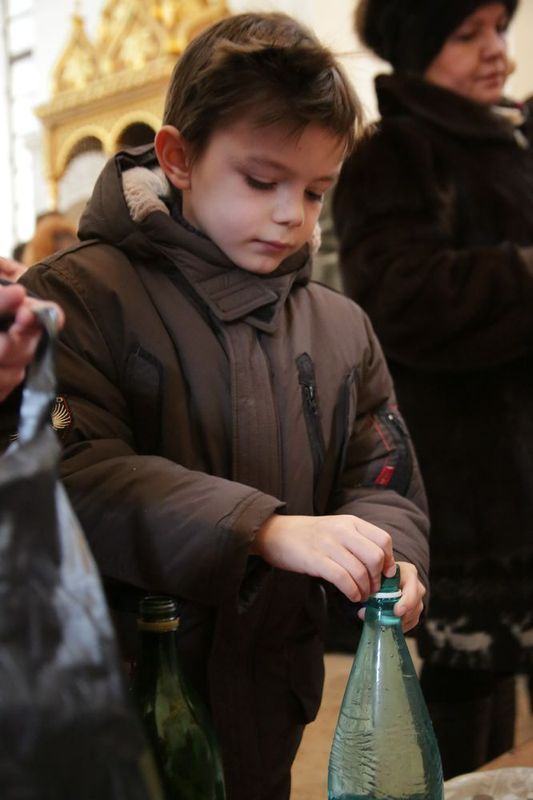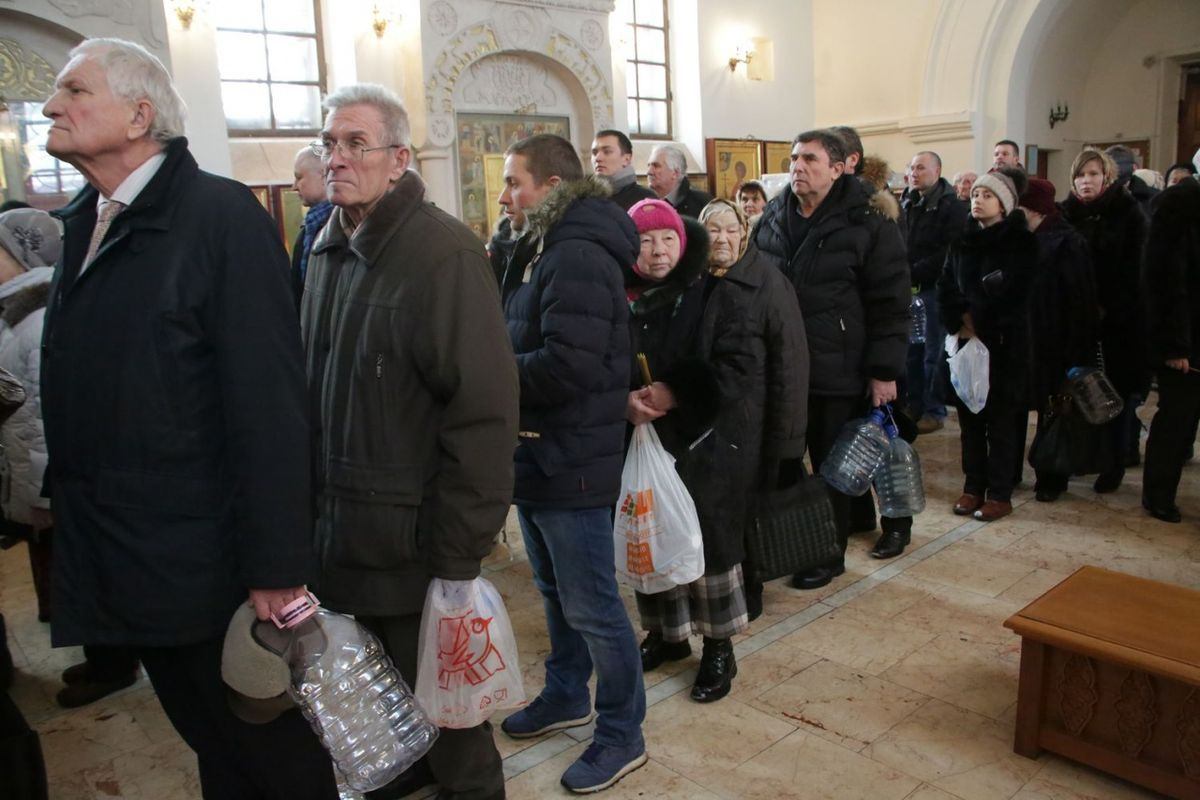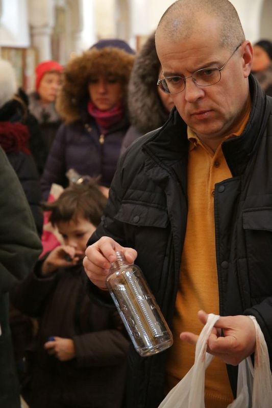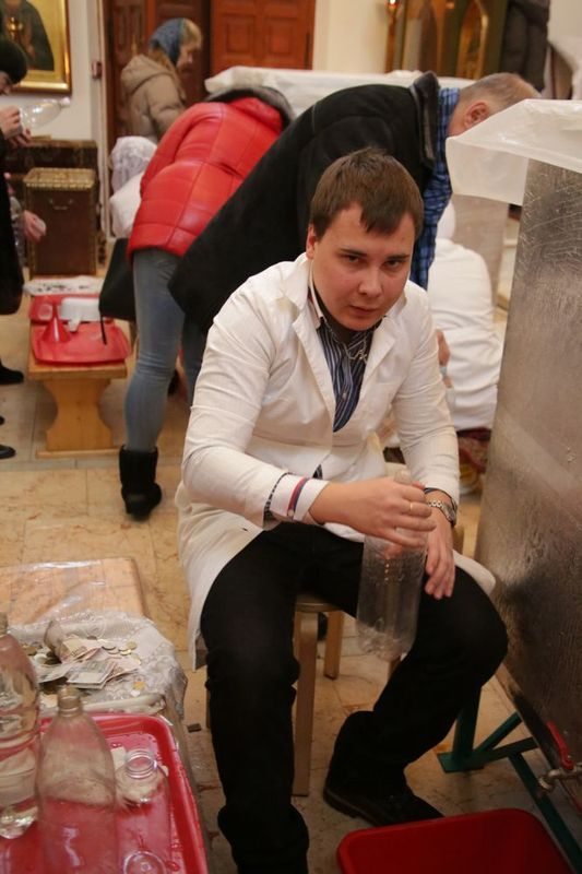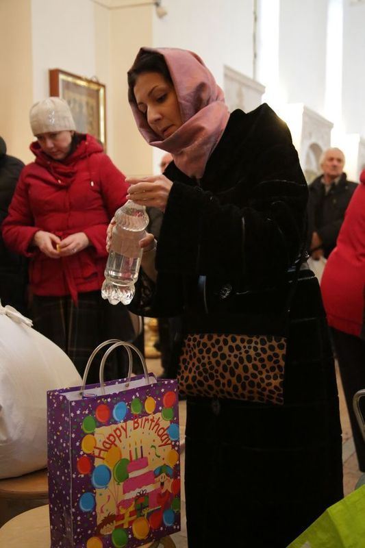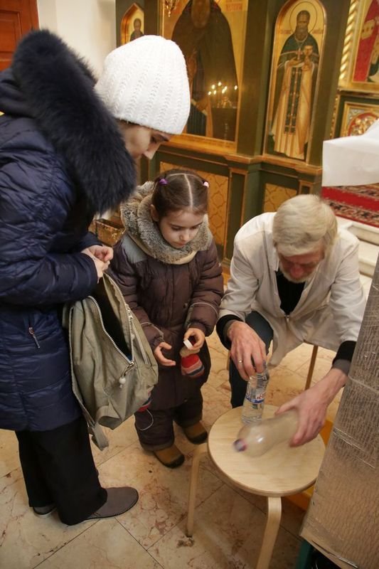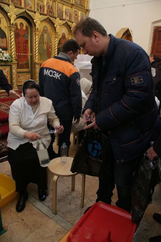 Раздачу святой воды верующим осуществляли посменно волонтеры сестричества, сотрудники храма и ученики Воскресной школы.
