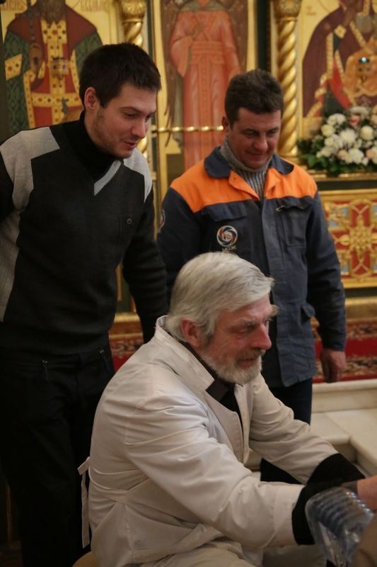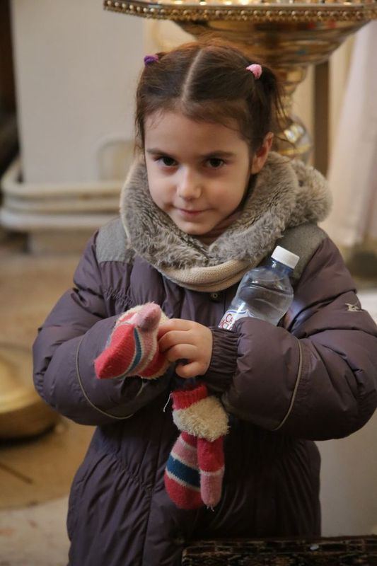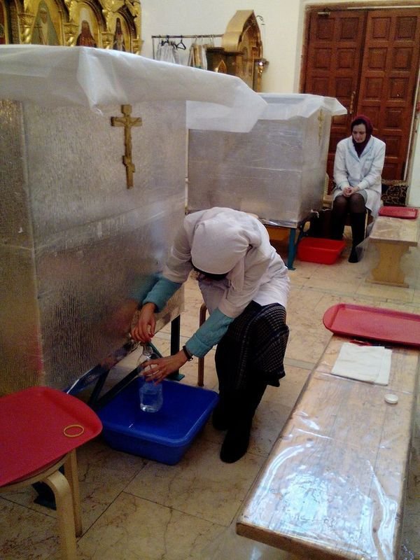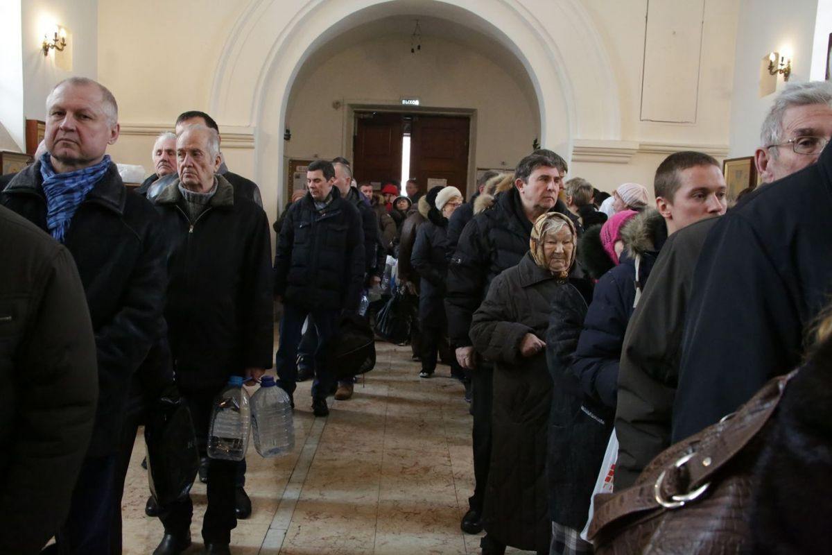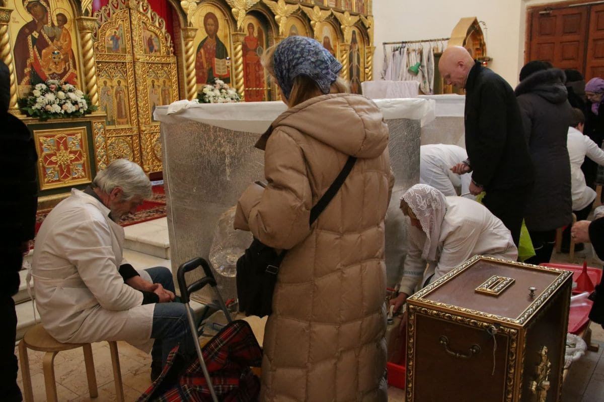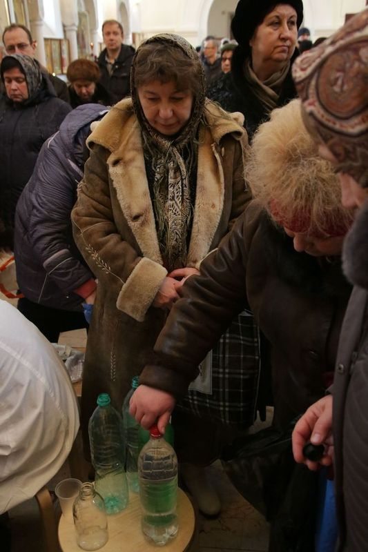 Раздачу святой воды верующим осуществляли посменно волонтеры сестричества, сотрудники храма и ученики Воскресной школы.