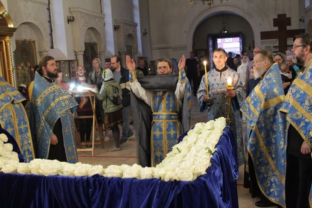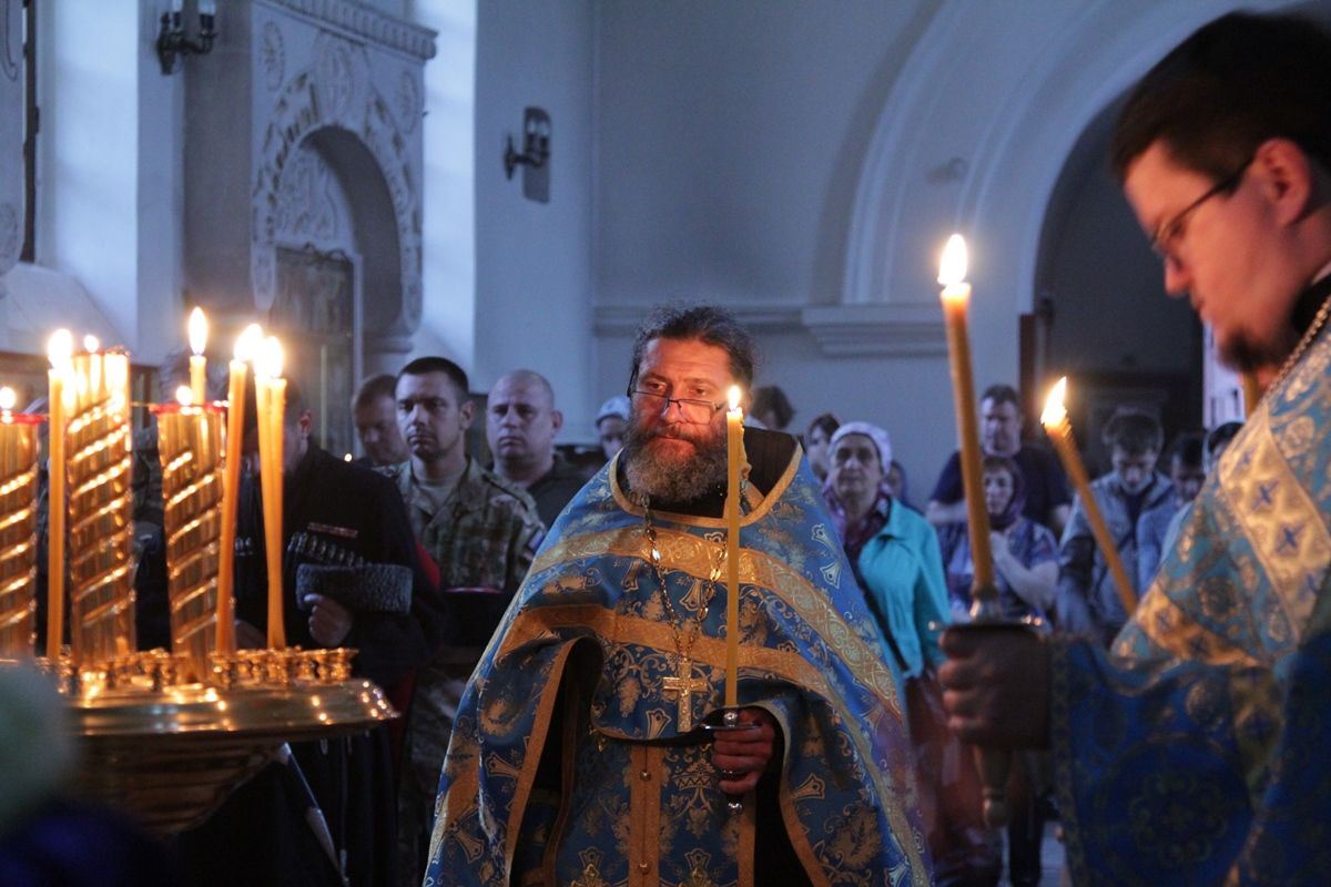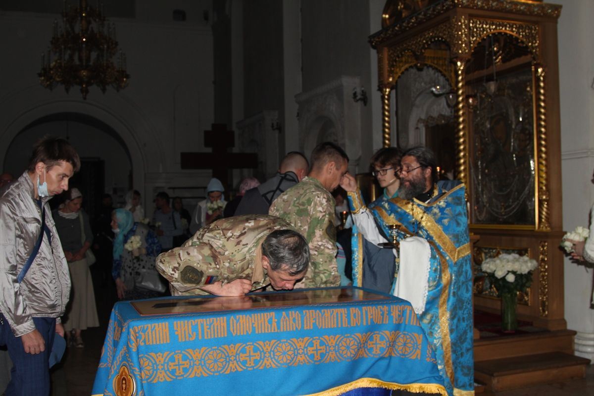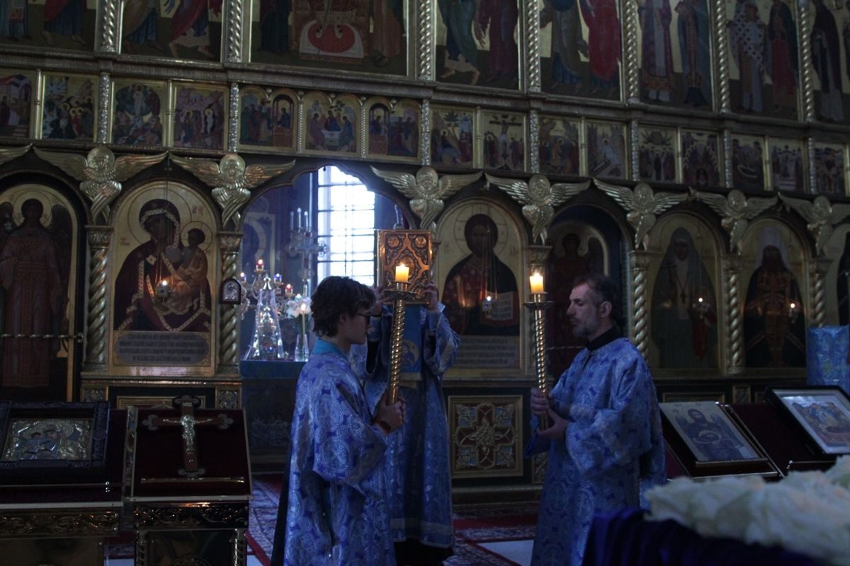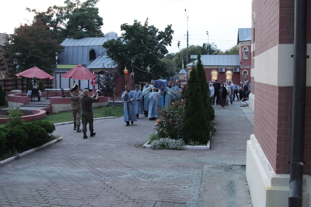 Вечером 30 августа 2020 года настоятель казачьего храма иконы Божией Матери «Отрада и Утешение» на Ходынском поле г. Москвы протоиерей Иоанн Кудрявцев совершил вечерню с чином погребения Божией Матери.