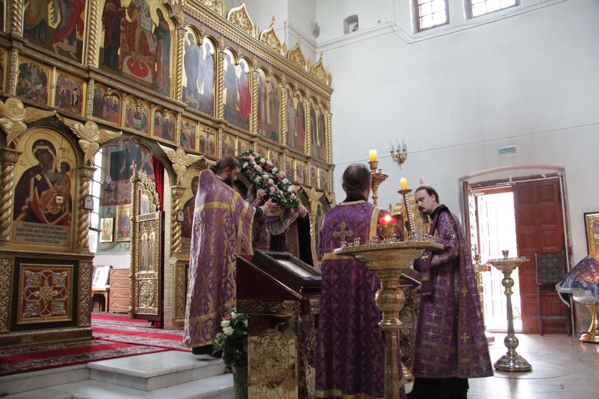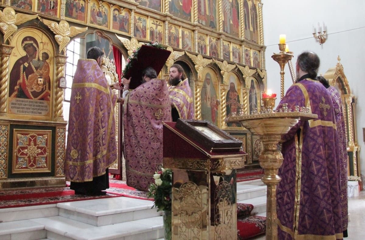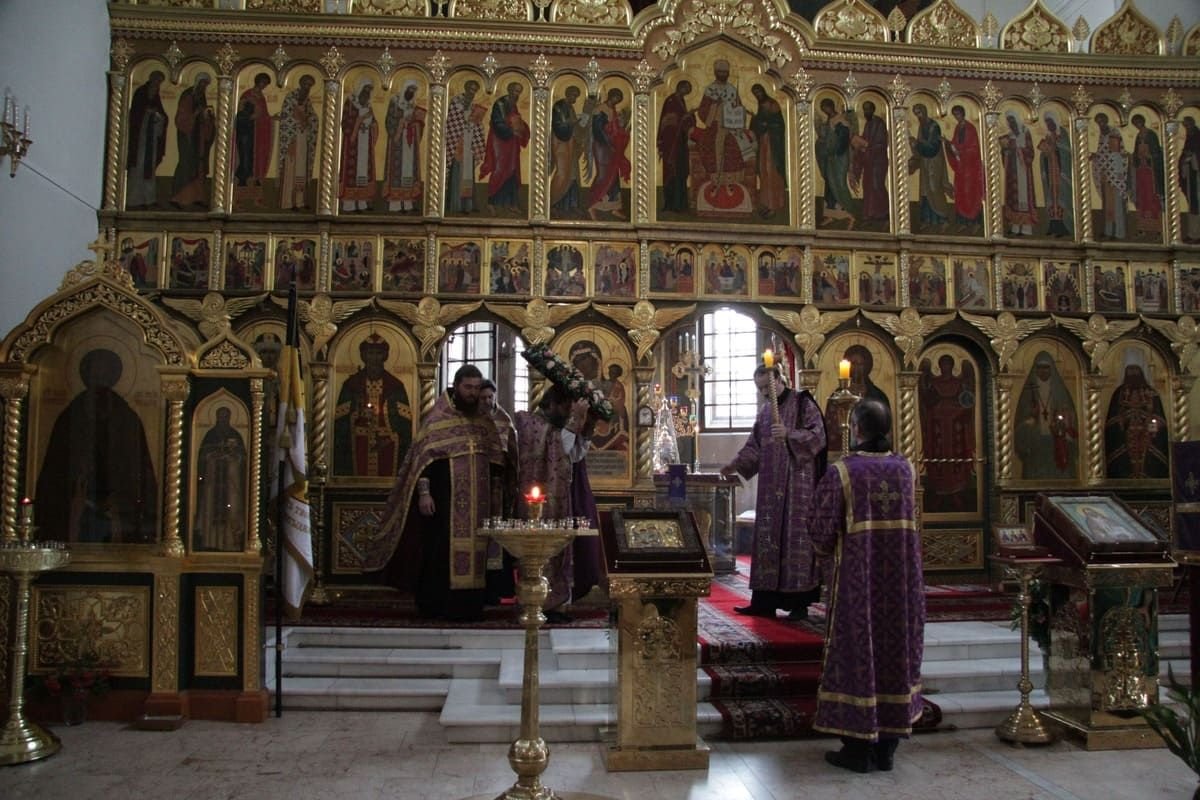 На утрене после великого славословия на середину храма был вынесен Крест Господень и совершено поклонение ему по чину Крестопоклонной Недели.