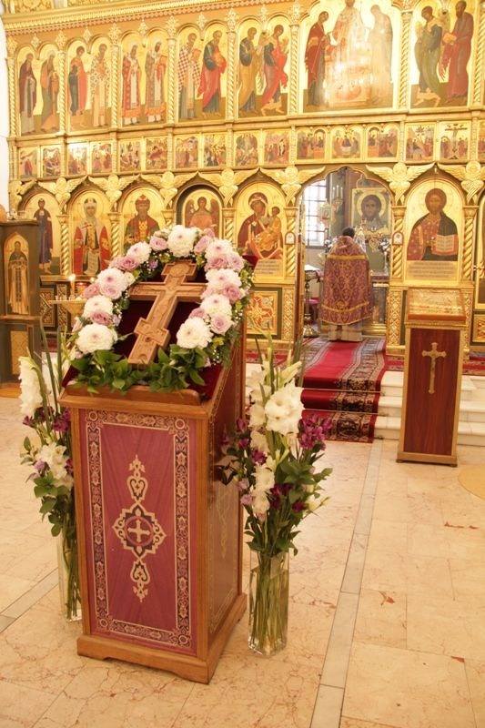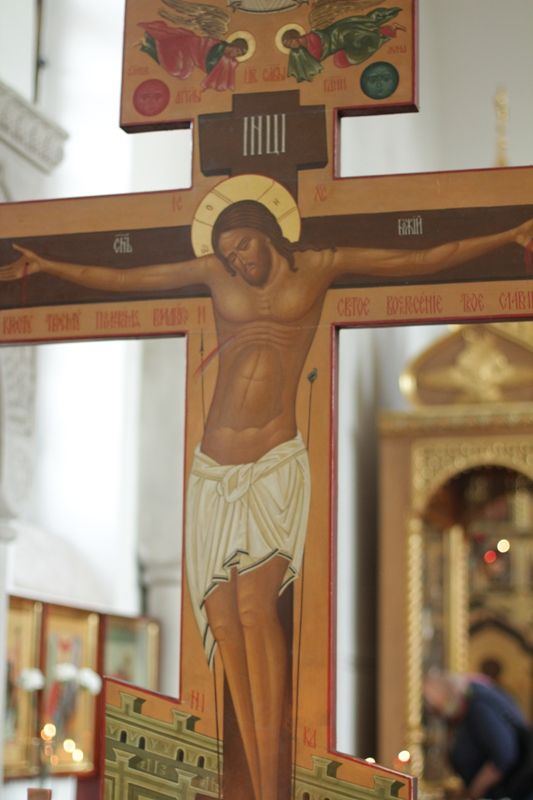 Вознесыйся на Крест волею,/ тезоименитому Твоему новому жительству/ щедроты Твоя даруй, Христе Боже,/ возвесели нас силою Твоею,/ победы дая нам на супостаты,/ пособие имущим Твое оружие мира// непобедимую победу