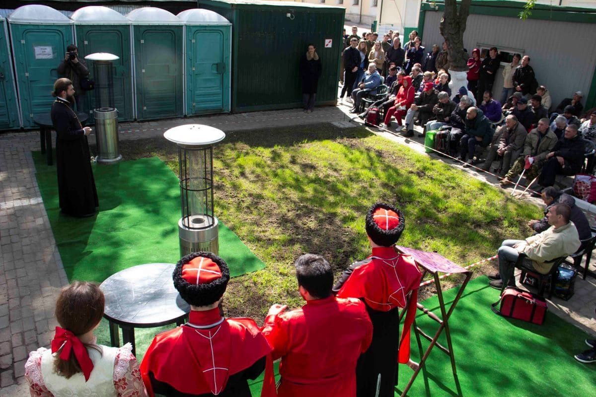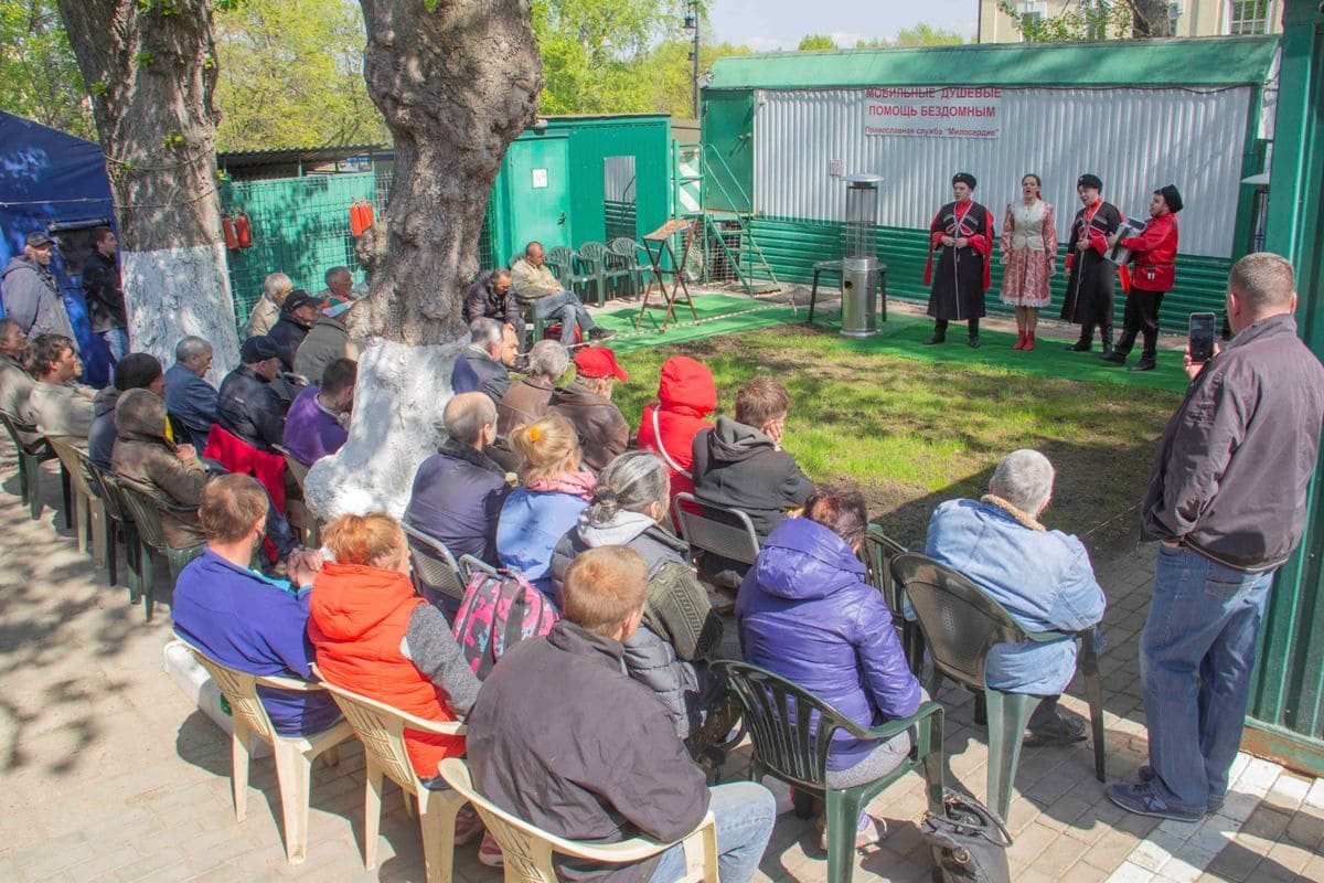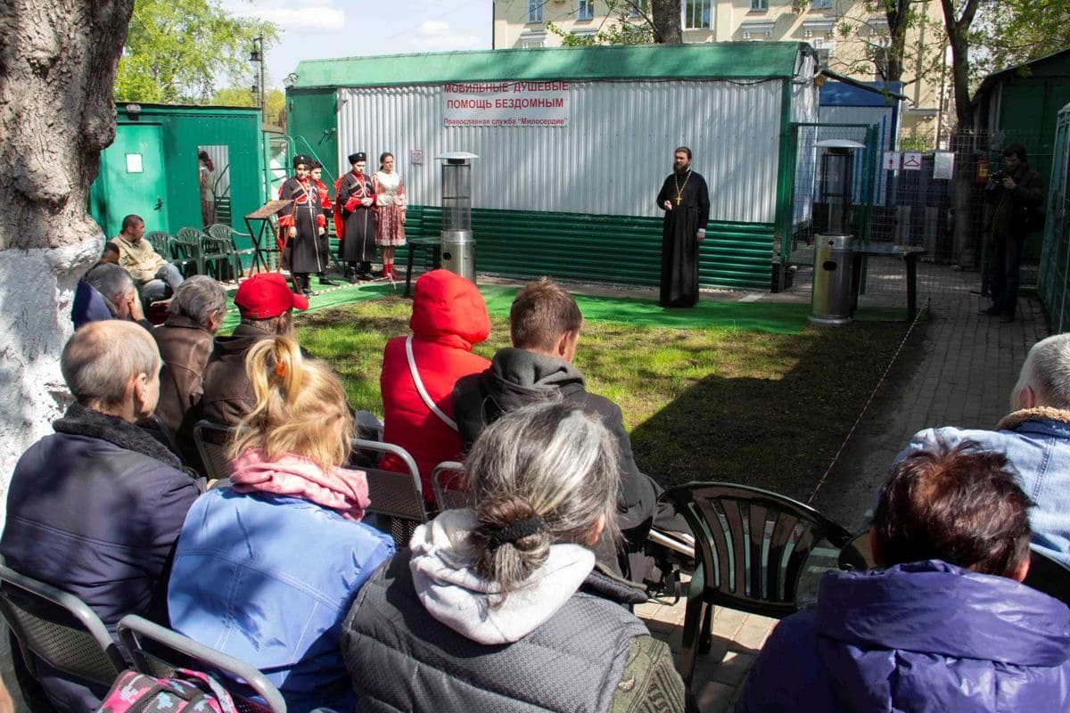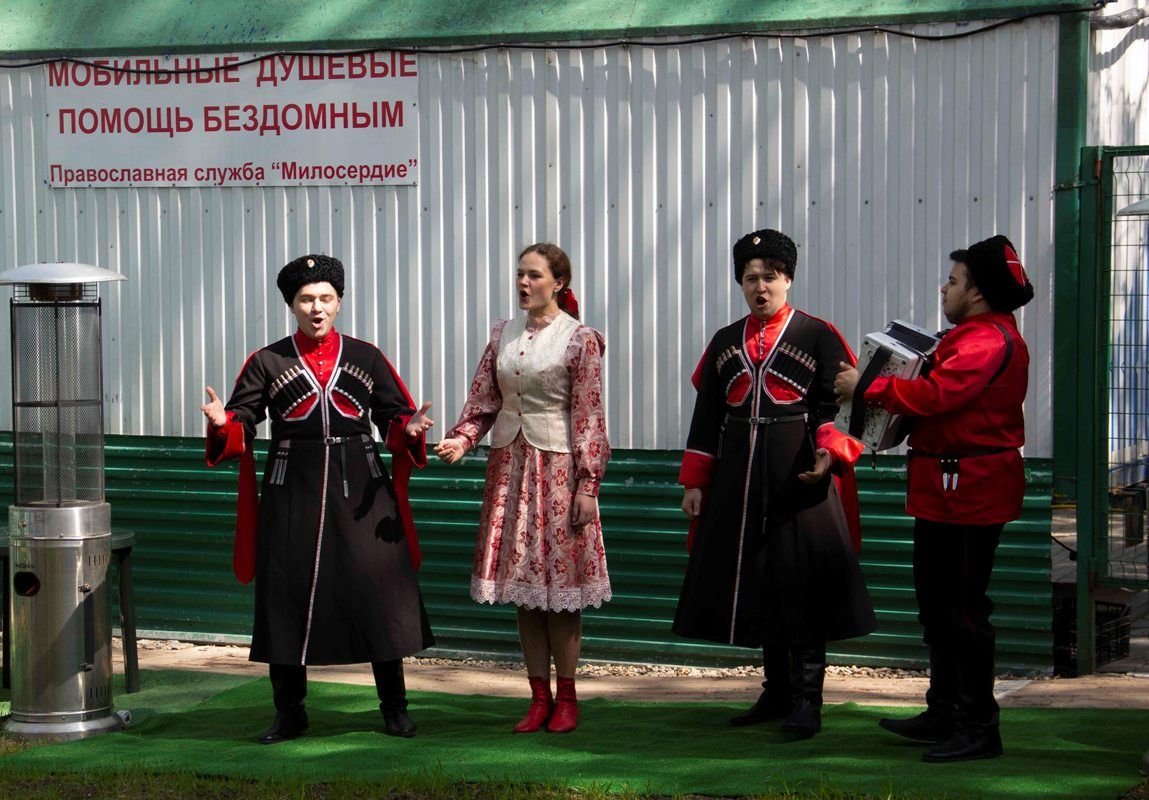 Благотворительная акция началась с концерта, подготовленного казачьим ансамблем Первого казачьего университета. Для бездомных и малоимущих артисты исполнили казачьи и военные песни. Затем к собравшимся обратился ответственный секретарь Синодального комитета иерей Тимофей Чайкин. Он поздравил пришедших в «Ангар спасения» с праздником Светлого Христова Воскресения. Говоря о значении Крестной жертвы Спасителя и Его Воскресении для человечества, отец Тимофей отметил, что причиной многих бед в жизни человека становится непослушание Богу. «Но мы не должны отчаиваться и замыкаться в проблемах. Выход есть всегда. Выход, который нам даровал Господь, пришедший в мир, распятый за грехи и воскресший для дарования нового счастья и жизни вечной. То, что невозможно человеку, возможно Богу. Главное не отчаиваться и жить с Богом».