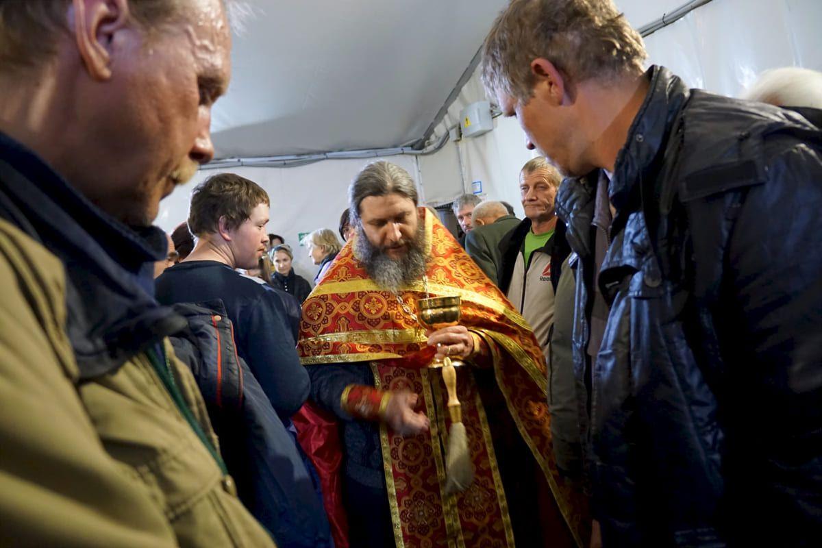 Перед кормлением был отслужен молебен, после которого батюшка окропил всех святой водой.