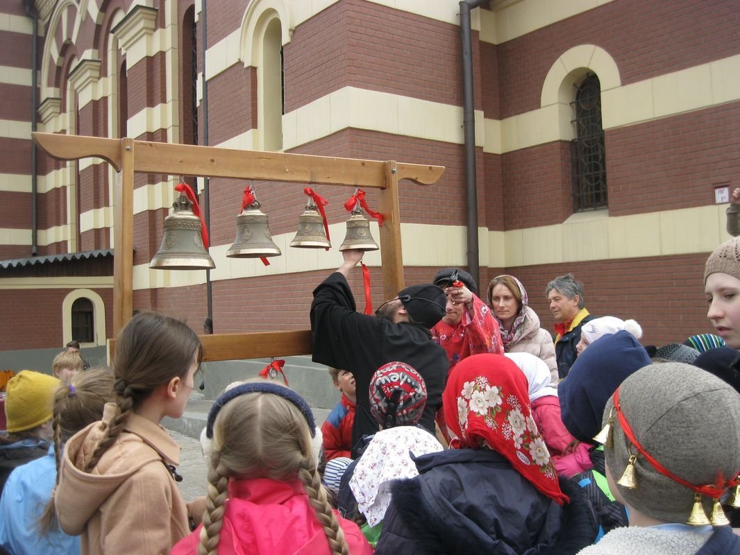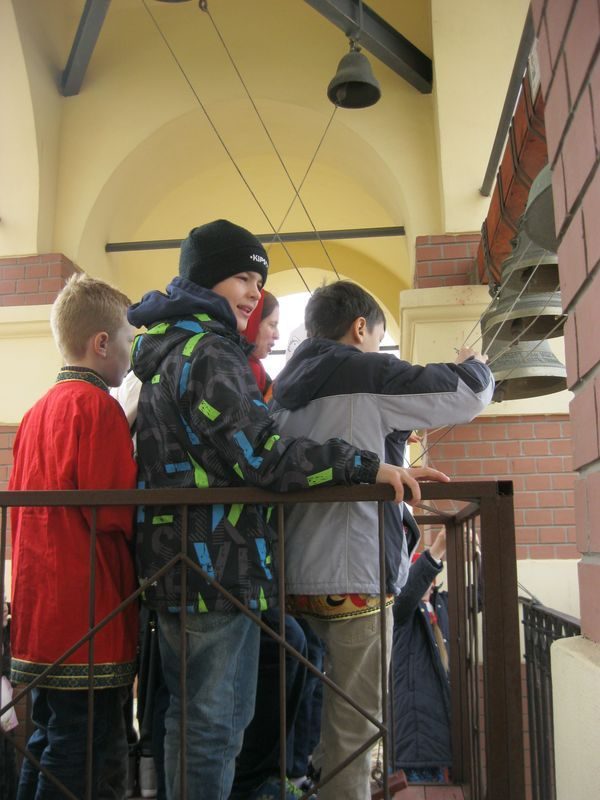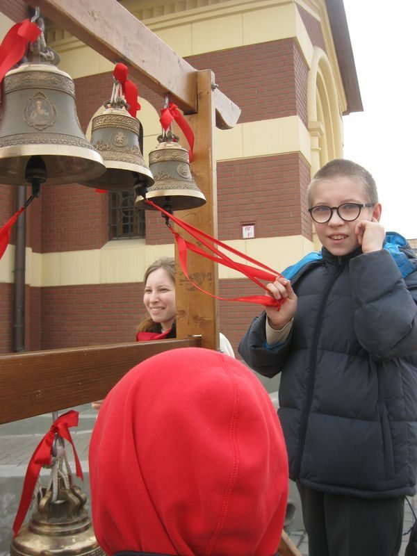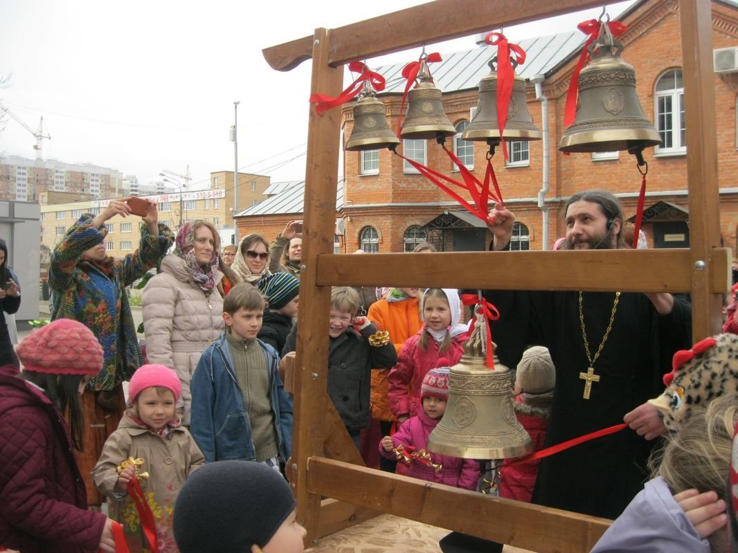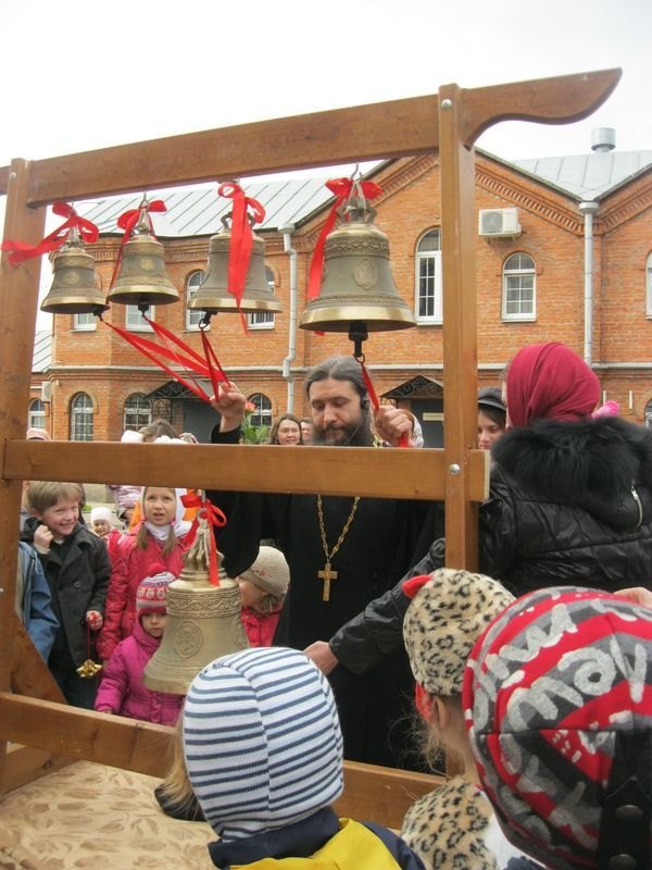 Затем настоятель нашего храма протоиерей Иоанн Кудрявцев показал детям и их родителям мастер-класс по колокольному звону. Все желающие — и дети, и взрослые — смогли позвонить в колокола.