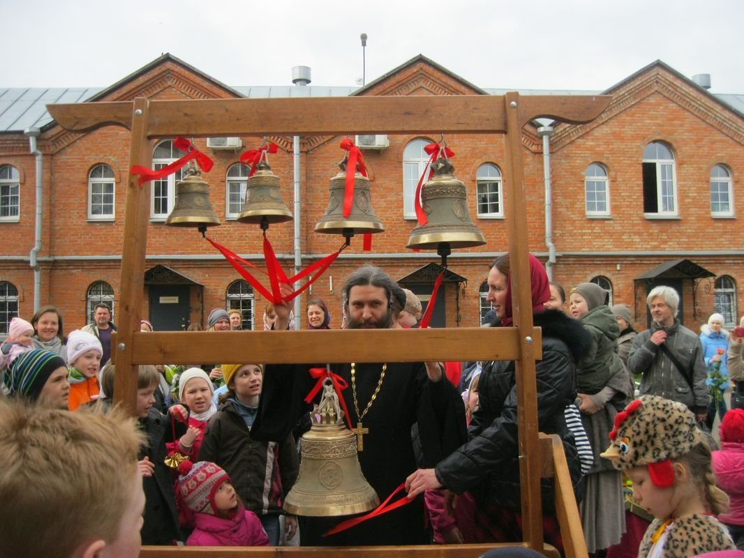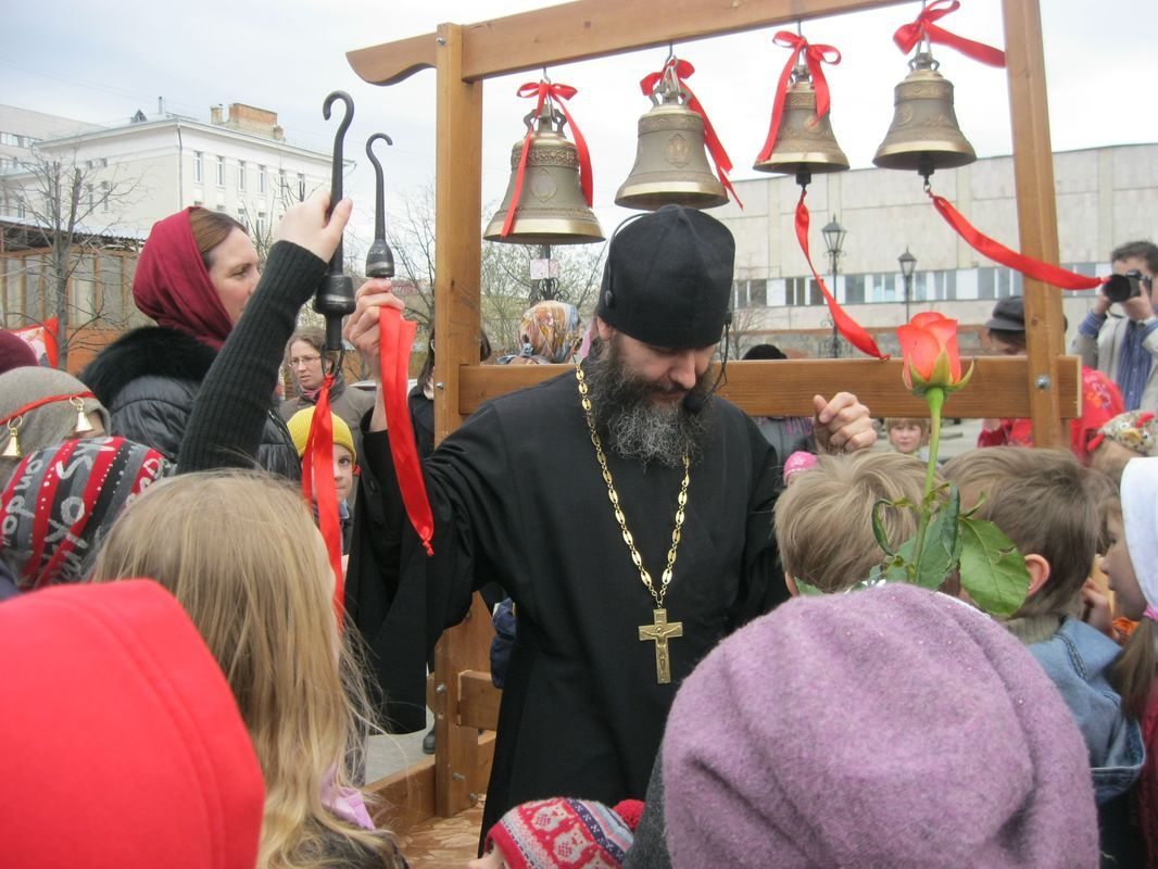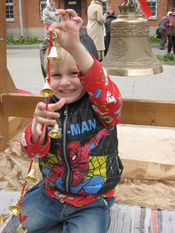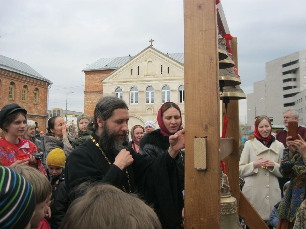 Затем настоятель нашего храма протоиерей Иоанн Кудрявцев показал детям и их родителям мастер-класс по колокольному звону. Все желающие — и дети, и взрослые — смогли позвонить в колокола.