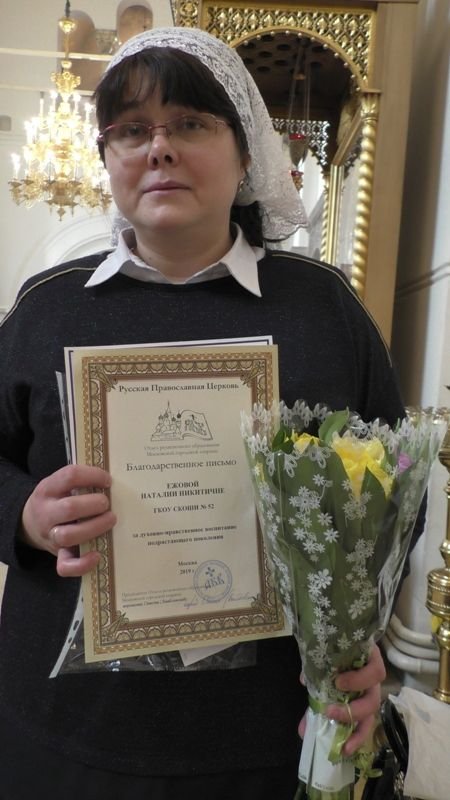 10 марта 2019 года после Божественной литургии настоятель храма иконы Божией Матери «Отрада и Утешение» на Ходынском поле г. Москвы протоиерей Иоанн Кудрявцев от имени председателя Отдела религиозного образования Московской городской епархии Русской Православной Церкви иеромонаха Онисима (Бамблевского) вручил педагогу ГКОУ СКОШИ № 52 Ежовой Наталии Никитичне Благодарственное письмо за духовно-нравственное воспитание подрастающего поколения.