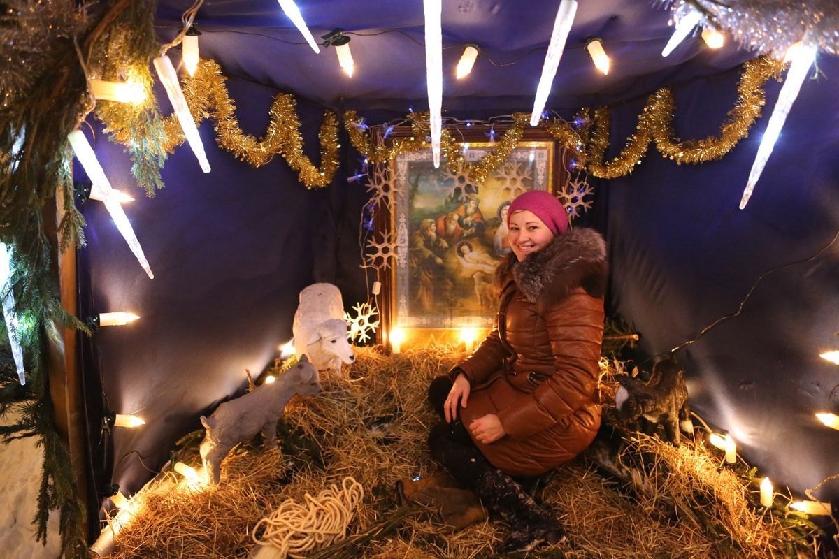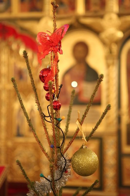 Перед праздником храм всегда с большой заботой убирают и украшают. В самом храме и во дворе устанавливают елочки и наряжают их. В Рождественскую ночь елочки своими мерцающими огоньками создают праздничную атмосферу. Особое внимание традиционно уделяется сооружению Рождественского вертепа – художественной композиции, которая изображает сцены Рождества Христова. В нашем храме по традиции два вертепа. Над иконой праздника — маленький, из еловых веточек, украшенный цветами, елочными игрушками и фонариками.  Внутри скульптурная композиция Святого семейства в окружении ягнят и овечек. А во дворе храма – большой Рождественский вертеп. Туда спокойно может зайти взрослый человек, чтобы приложиться к иконе Рождества Христова.