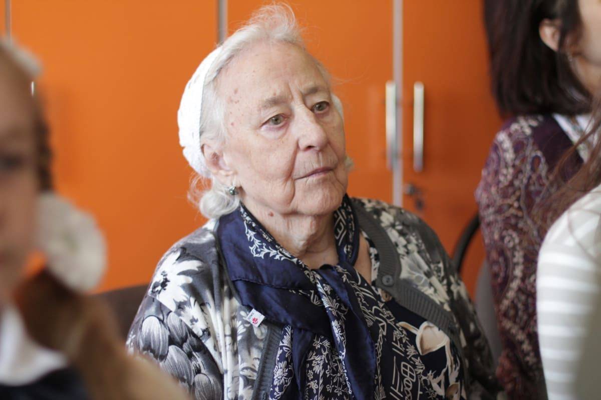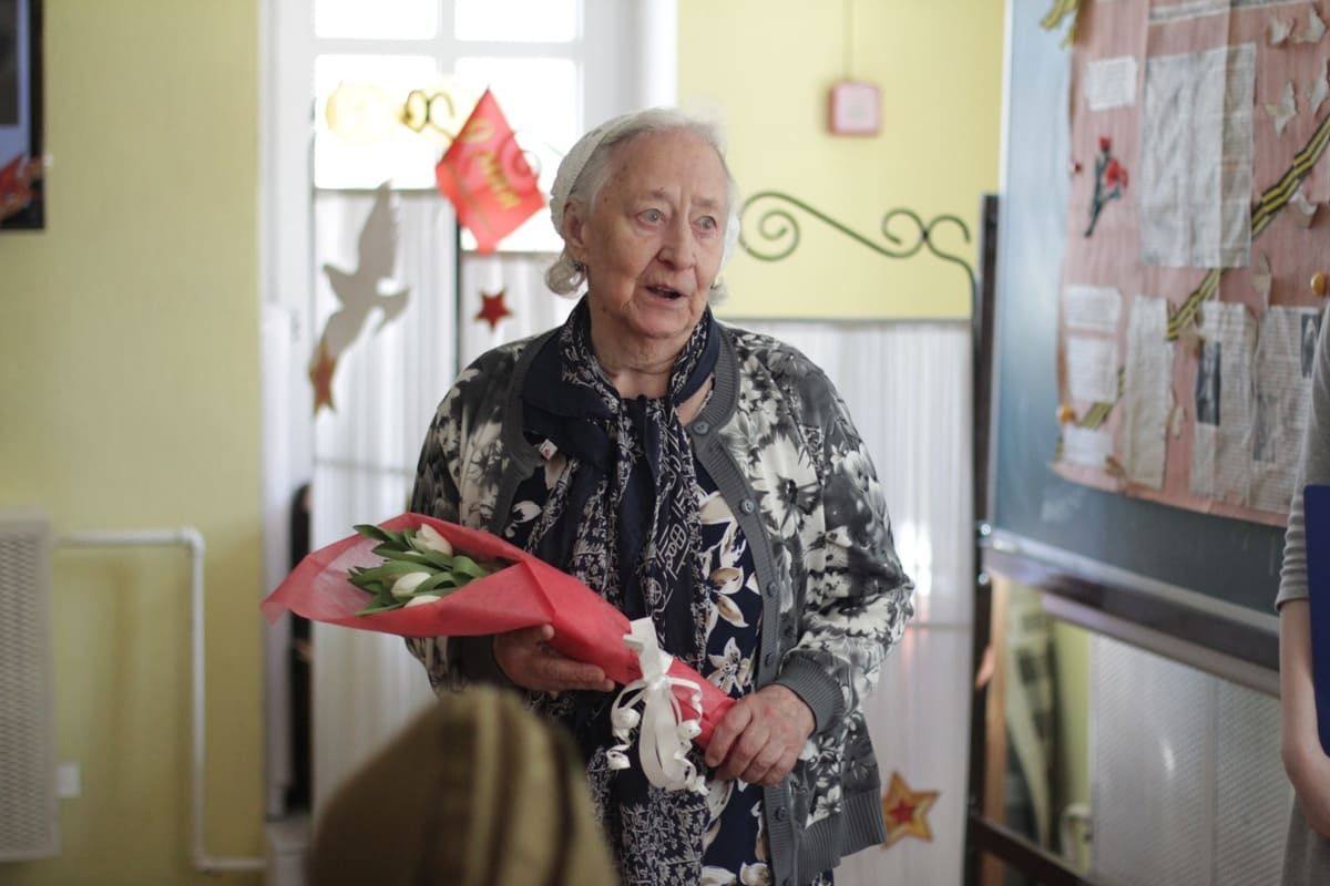 Затем от имени всех присутствующих директор школы Нина Бородинская поздравила нашего преподавателя Тамару Борисовну, участницу войны, с праздником Победы и вручила ей цветы.