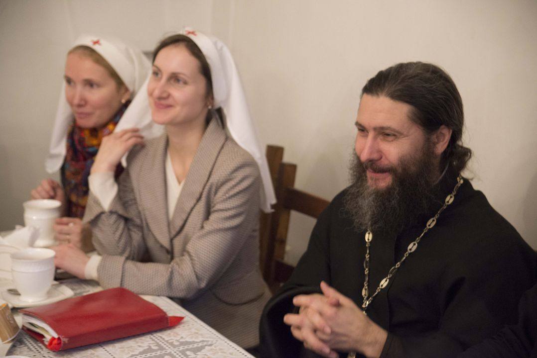 Сестер, которые несут служение при больничном храме, интересовал опыт посвящения, а также критерии, по которым духовнику и сестрам становится понятна готовность вступления в общину. Отец Владимир поделился своим опытом. В сестричество вступают только те сестры, которые живут церковной, Евхаристической жизнью. Также важно, чтобы сестра зарекомендовала себя трудолюбивой, исполнительной. Существует обряд посвящения сестер. Во время молебна, обычно после чтения Евангелия, сестра дает обет служить Богу, людям и творить дела милосердия. После зачитывания обета на сестру повязывают белый платок, — символ покрова, Божией благодати и помощи.